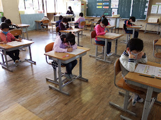 どの教室も机を離し,3つの密をさけて,確認テストや補充授業などを行いました。6年生は人数が多いので,3つの教室に分けて学習しました。