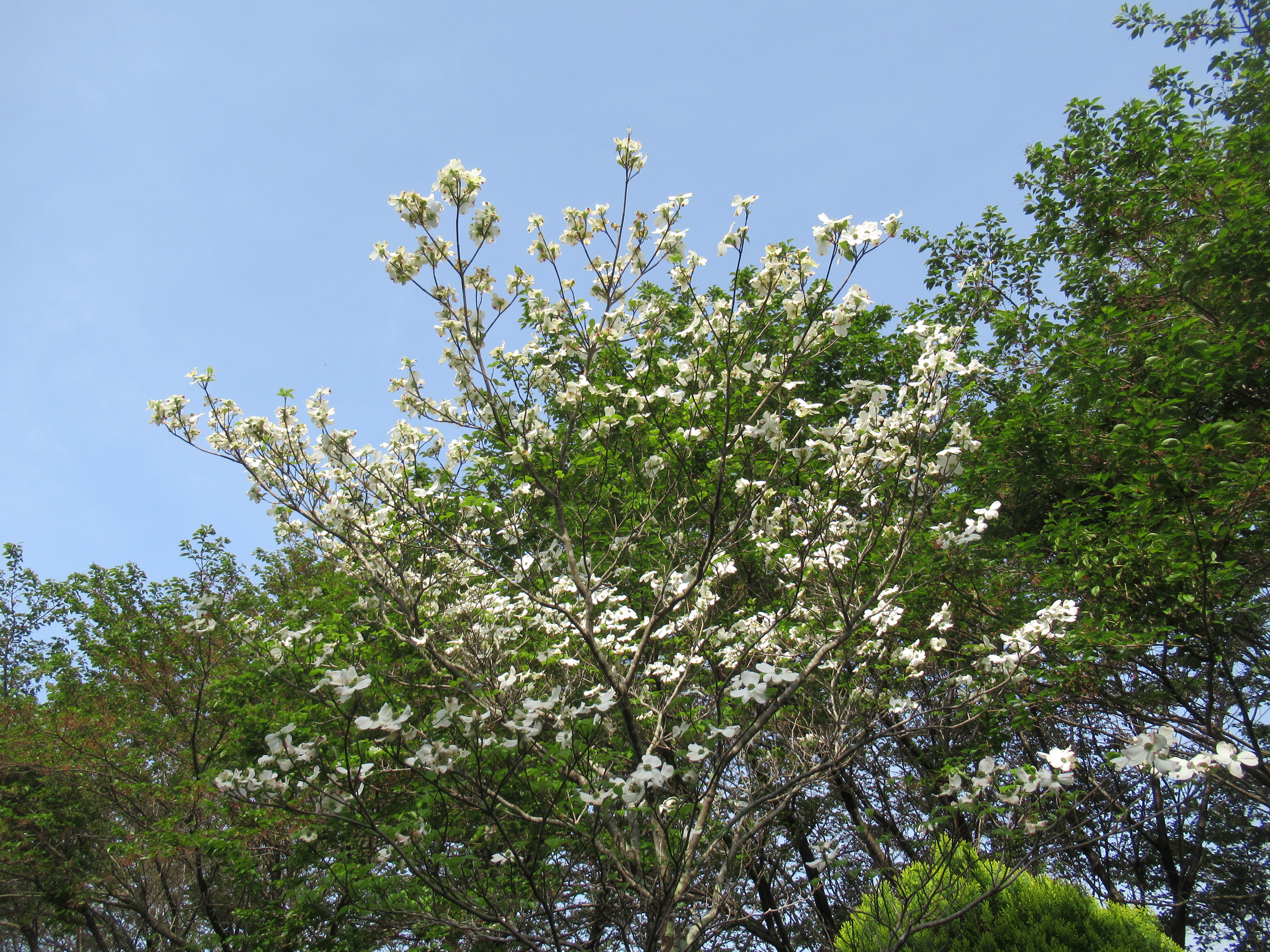 校庭の桜は散ってしまいましたが、春はいろいろな花が咲きます。職員玄関の外では、ノースポールや卒業記念で植えられたハナミズキが咲いています。どちらも白く、きれいに咲いています。
