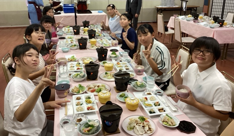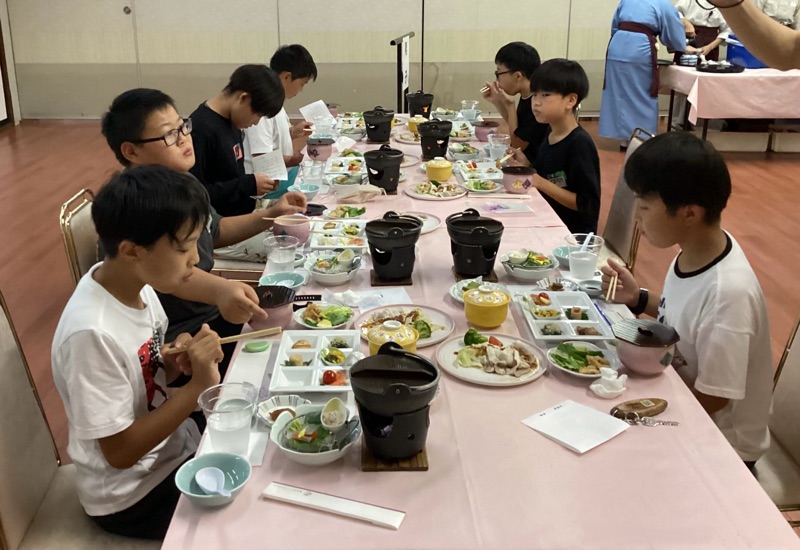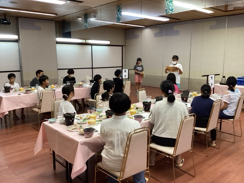 ホテルに到着!雨のため、入館式は夕食会場で行いました。その後は、夕食をいただき、みんな美味しそうに食べていました!