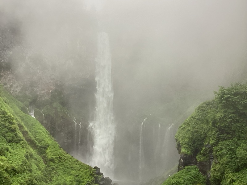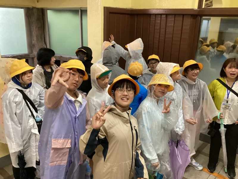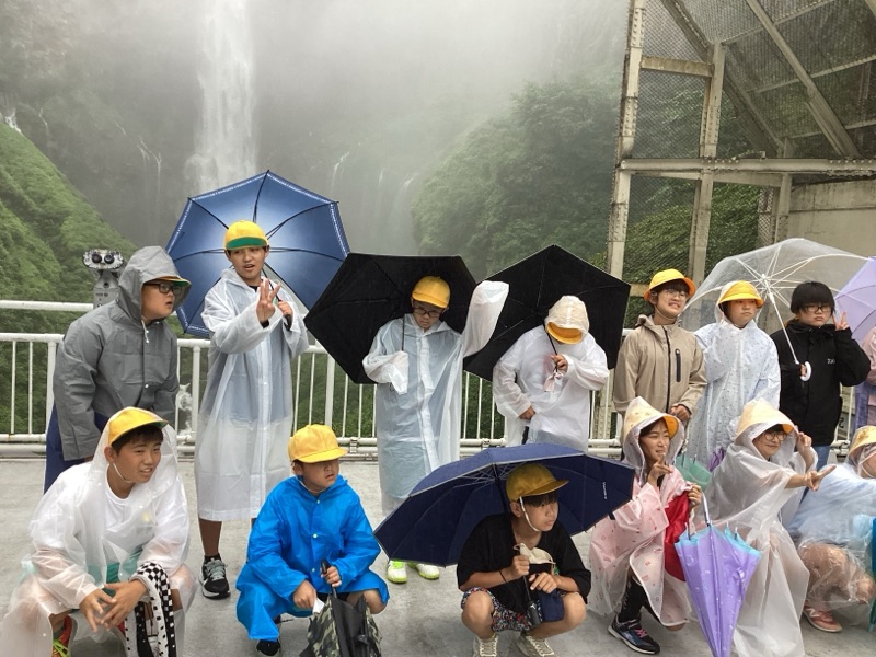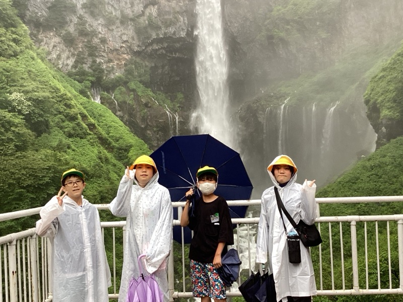 華厳の滝に到着しました。さっきまで強い雨だったのが、「中二の子」たちが滝の前に到着すると、弱雨に変わりました。記念撮影も終え、宿泊先のホテルにむかいます!みんな元気です。